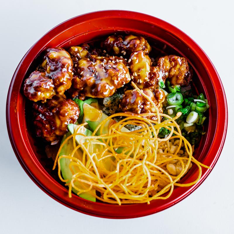 Rice, chicken karaage, honey pineapple teriyaki, avocado, cucumber, carrot, green onions, sesame seeds, tempura bits
