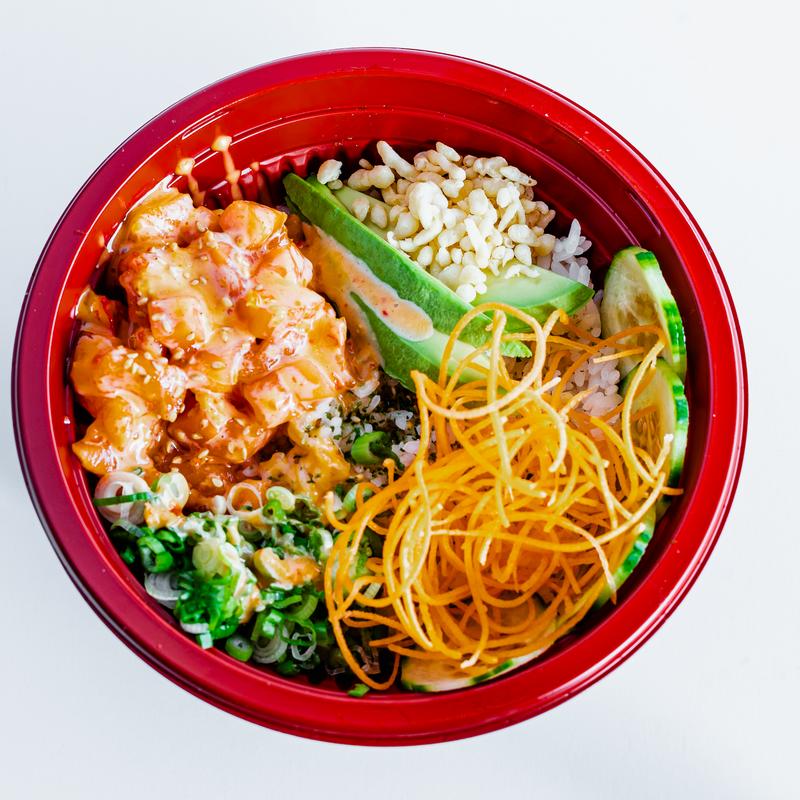 Rice, salmon, poke sauce, avocado, cucumber, carrot, green onions, sesame seeds, tempura bits